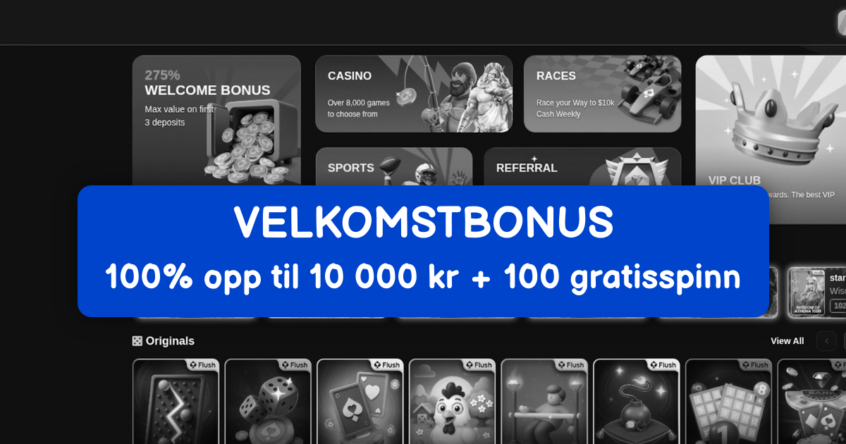 - Tilgjengelighet: Flush Casino aksepterer spillere fra Norge. Dette er et internasjonalt tilbud, ikke et norsk lisensiert nettcasino.
